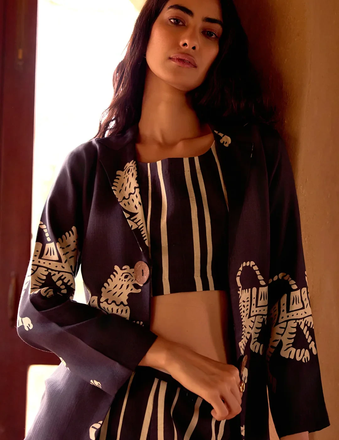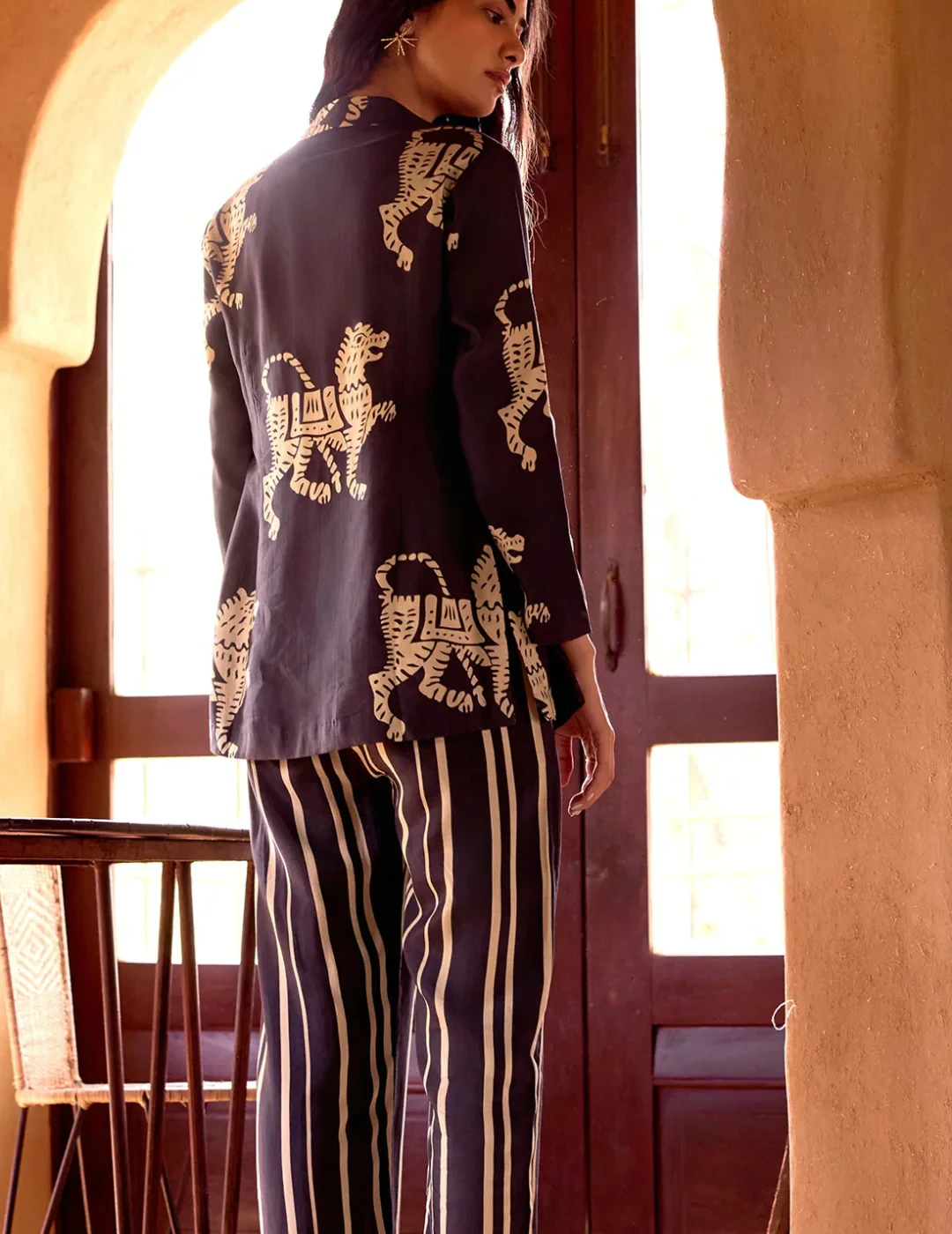 Make a bold statement with this black printed three-piece cotton set featuring a round-neck bustier, tailored pants, and a full-sleeved overlay jacket. The intricate print and structured silhouette offer a perfect mix of tradition and trend.