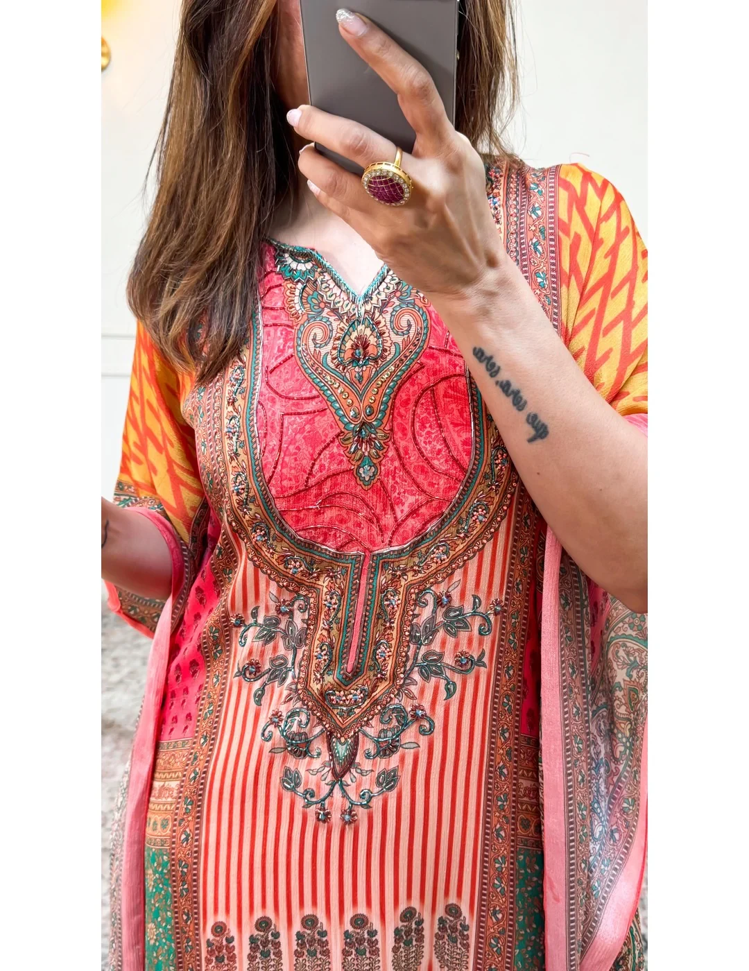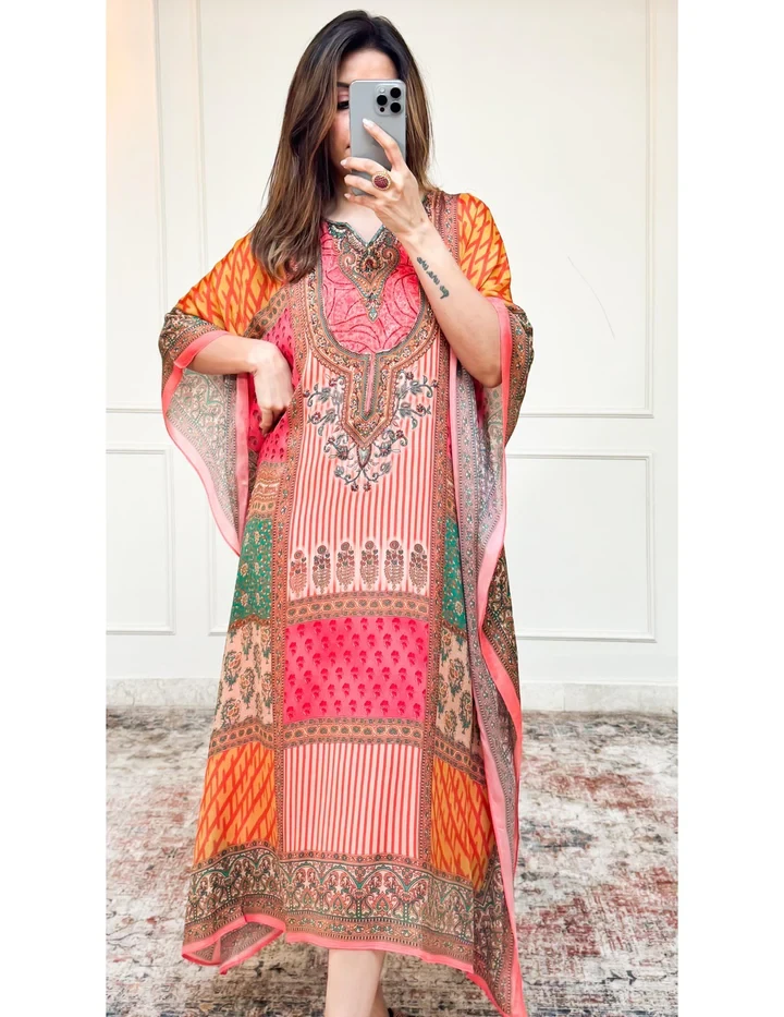 Floral Printed Multicolor Long Kaftan: A vibrant and stylish choice for relaxed yet fashionable outings and beachside elegance.