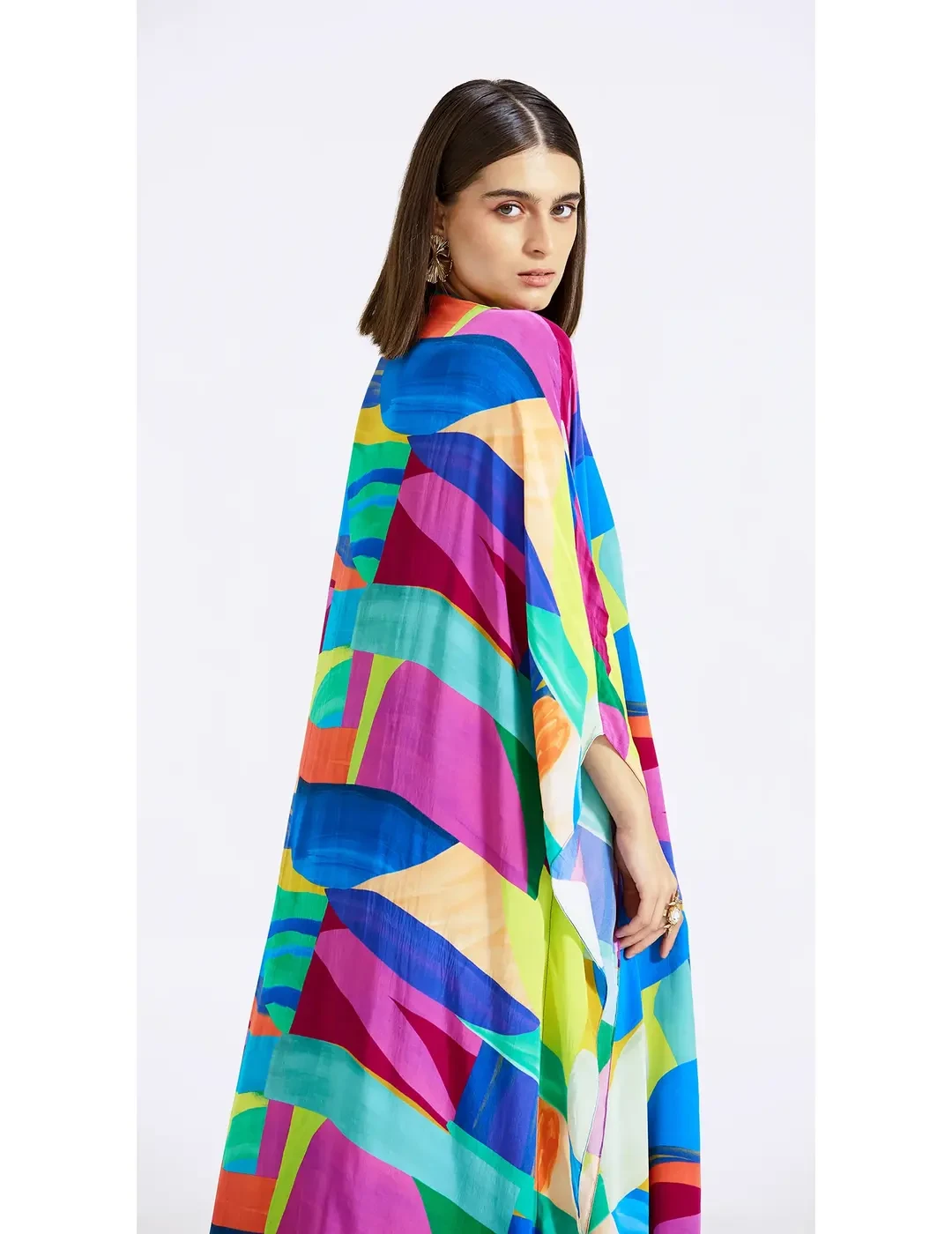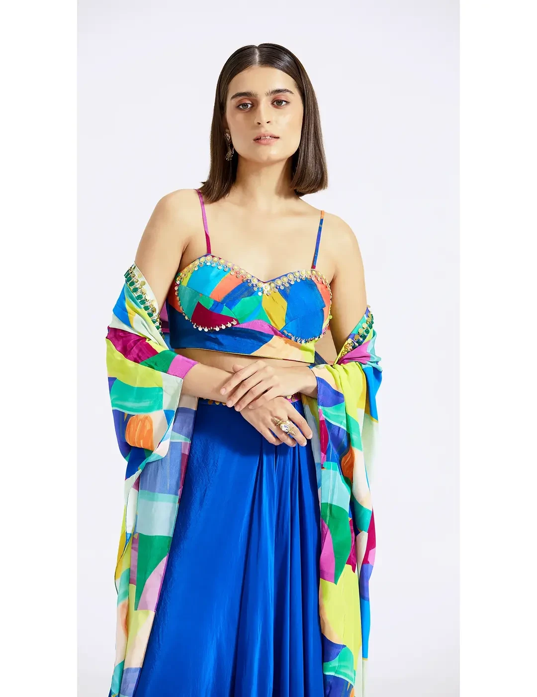 Layered with a flowy cape, this multicoloured skirt set crafted in crepe features a skirt and a blouse with abstract prints and intricate handwork on the borders, hemline and waist belt.