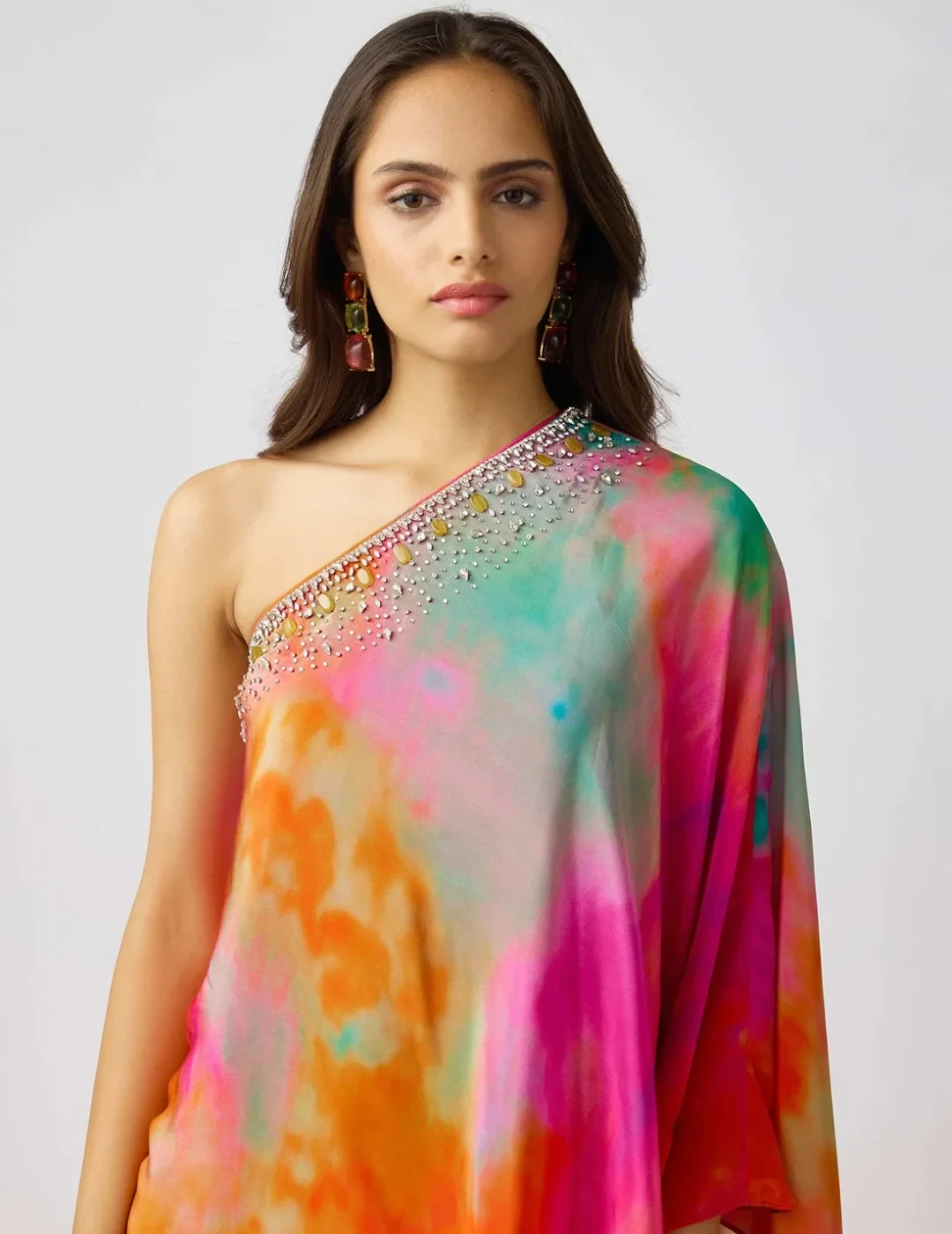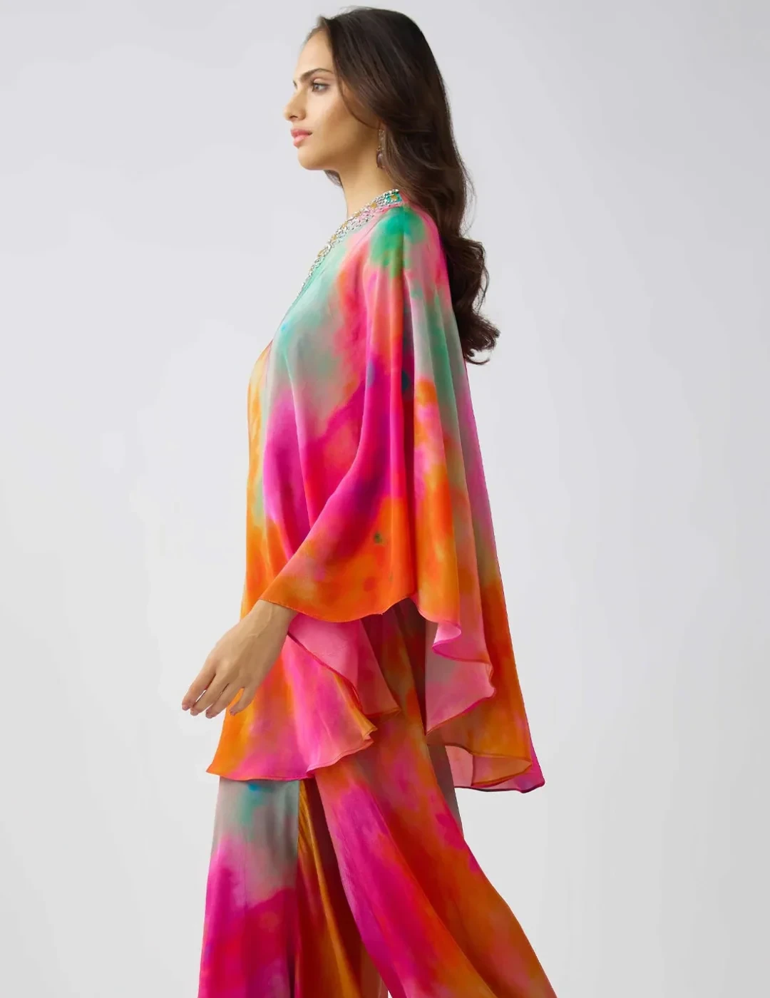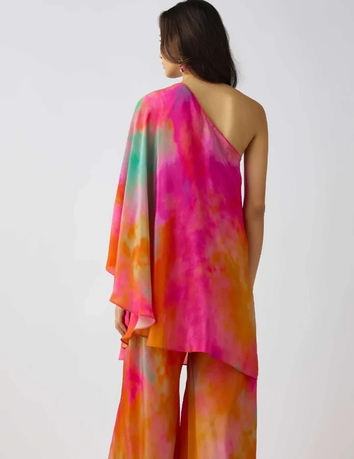 Dazzle in this exquisite Multicolor Sharara Set, adorned with crystal, bead, and gem embroidery on luxurious crepe fabric. This statement ensemble features a chic one-shoulder bustier, flowy sharara pants, and a dramatic cape, blending modern elegance with traditional charm. The bustier comes with padding for a structured fit, making it a perfect choice for festive celebrations, weddings, and cocktail soirées.