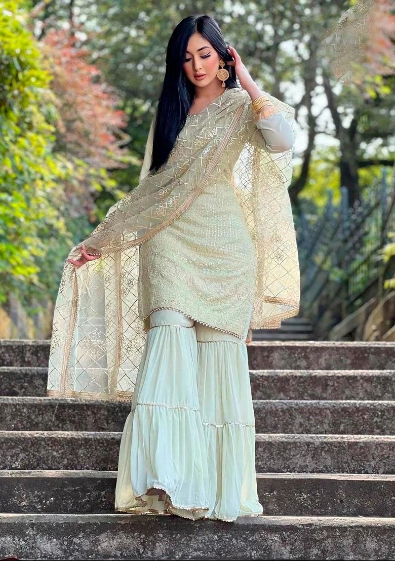 Majority of our items contain embellishments and embroidery and therefore fragile in their usage. From time to time beading/ sequence may get displaced and this is not regarded as a fault but is due to the nature of the work. These garments should be worn with care.