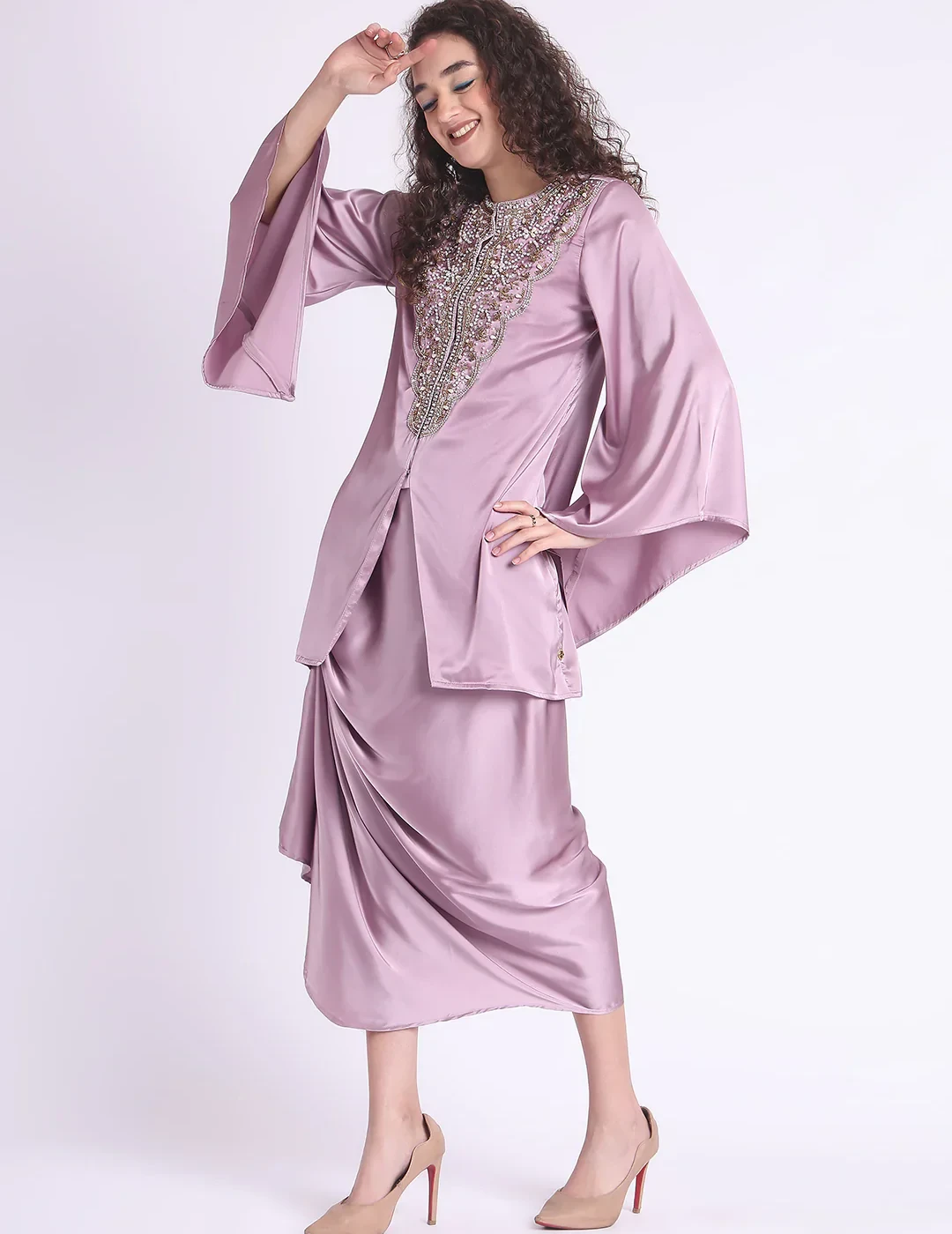 Elevate your wardrobe with the timeless elegance of the Yami Embroidered Co-ord Set by Chique. Crafted in luxurious Satin Lycra (100% polyester), this blush-toned ensemble blends artisanal craftsmanship with contemporary flair. The top features delicate embroidery that adds a touch of sophistication, while the tailored bottoms ensure all-day comfort and style.