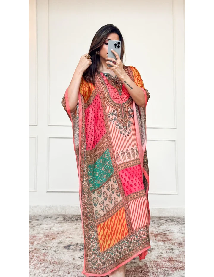 Floral Printed Multicolor Long Kaftan: A vibrant and stylish choice for relaxed yet fashionable outings and beachside elegance.