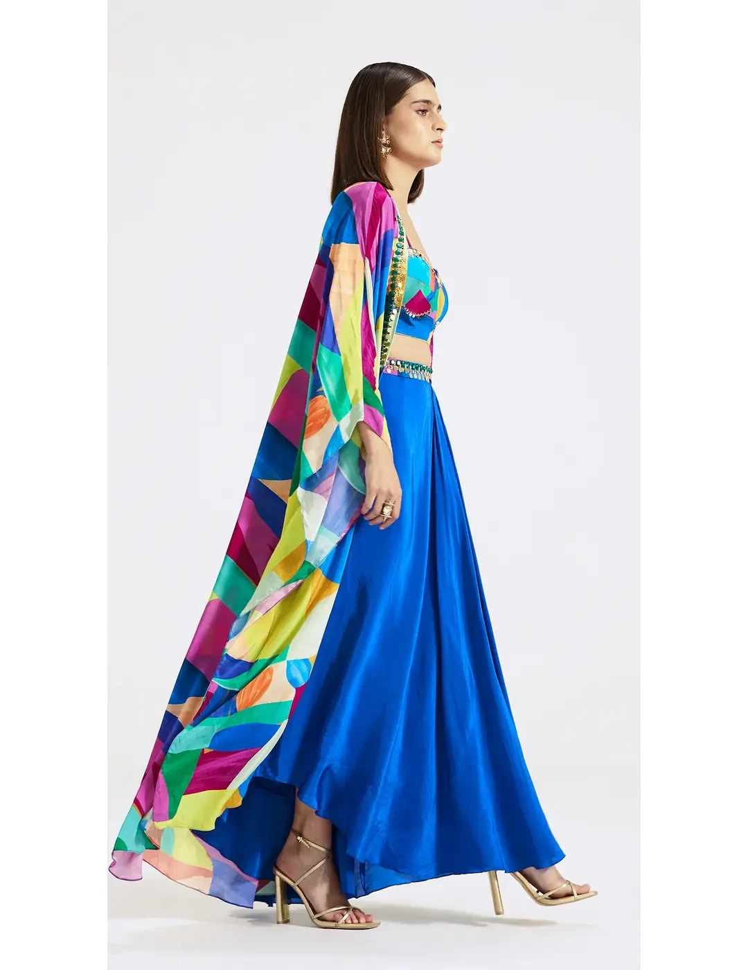 Layered with a flowy cape, this multicoloured skirt set crafted in crepe features a skirt and a blouse with abstract prints and intricate handwork on the borders, hemline and waist belt.