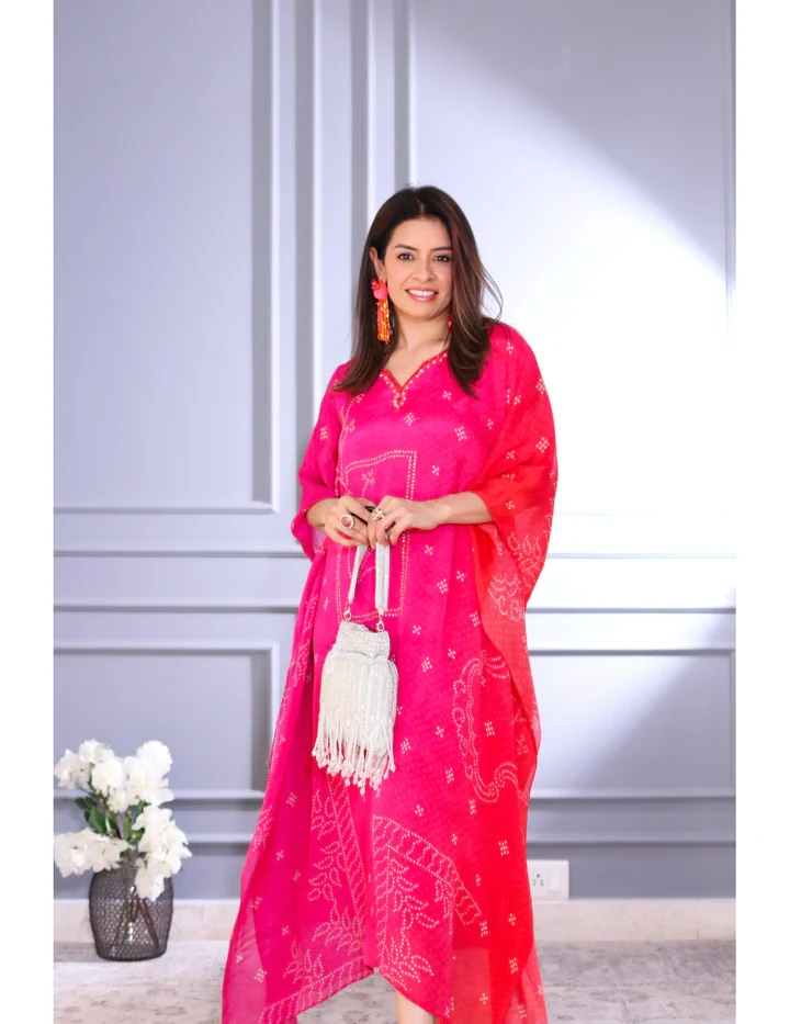 This pink Viscose Chinon kaftan offers a luxurious drape and soft texture, featuring a relaxed silhouette perfect for resort wear, festive gatherings, or casual elegance. It comes with an attached inner for added comfort and ease.